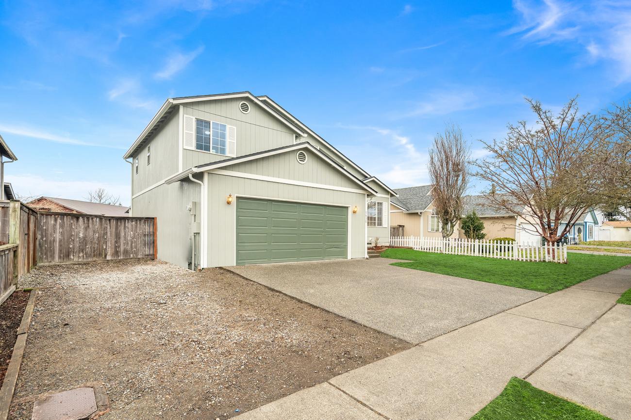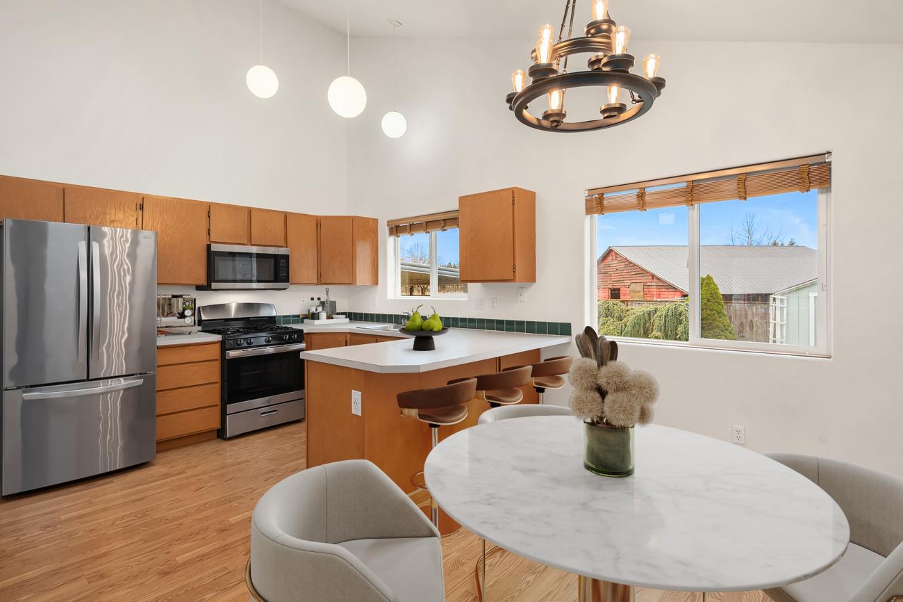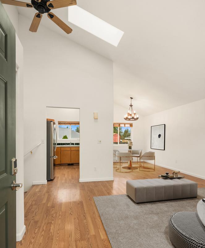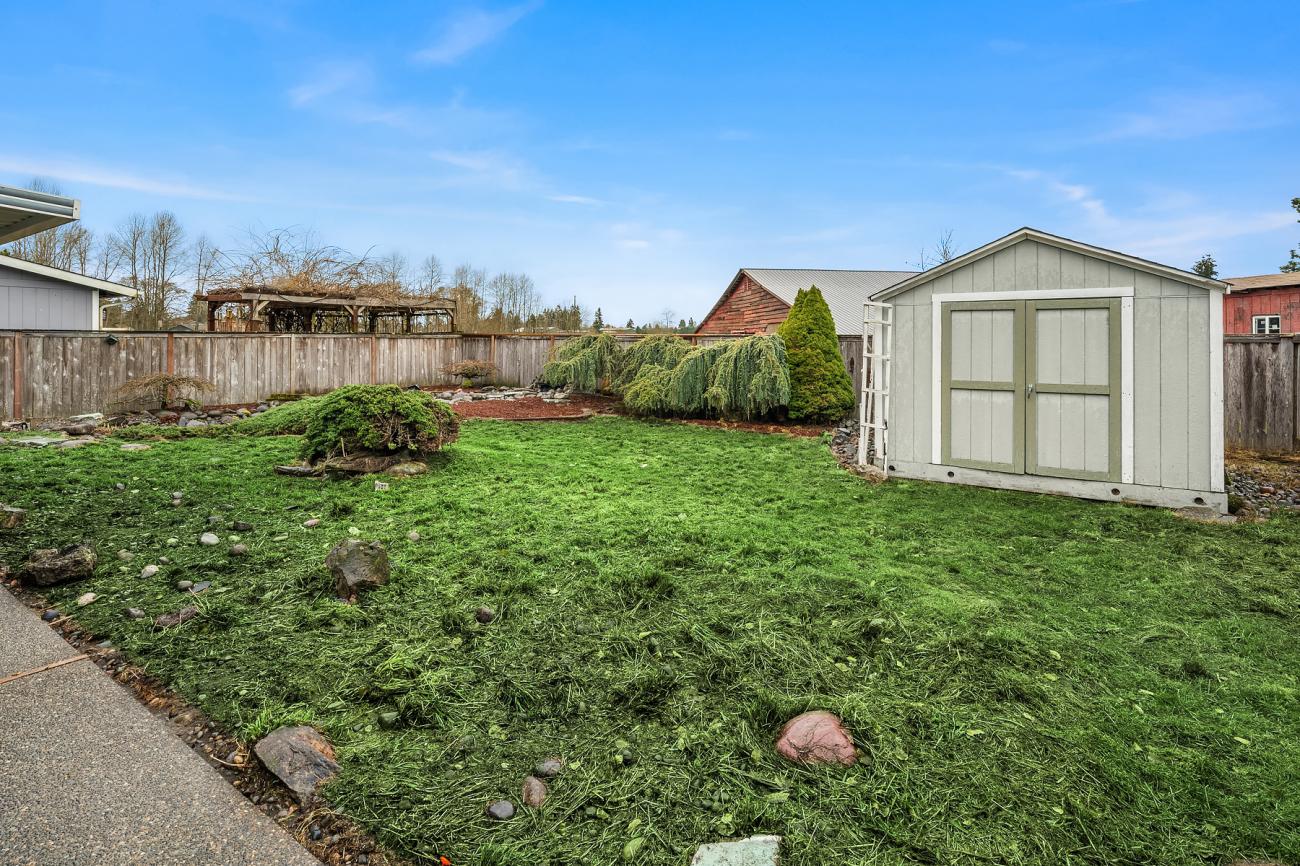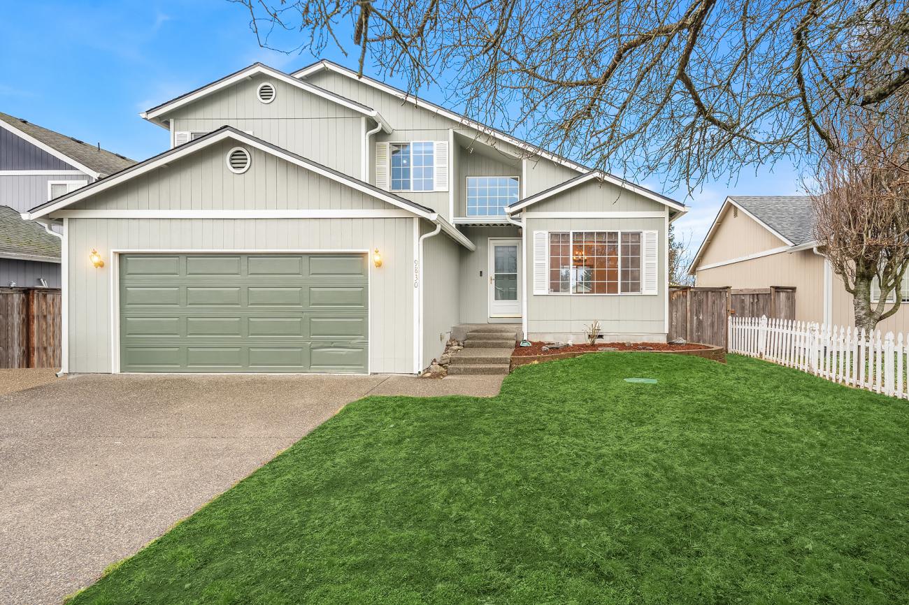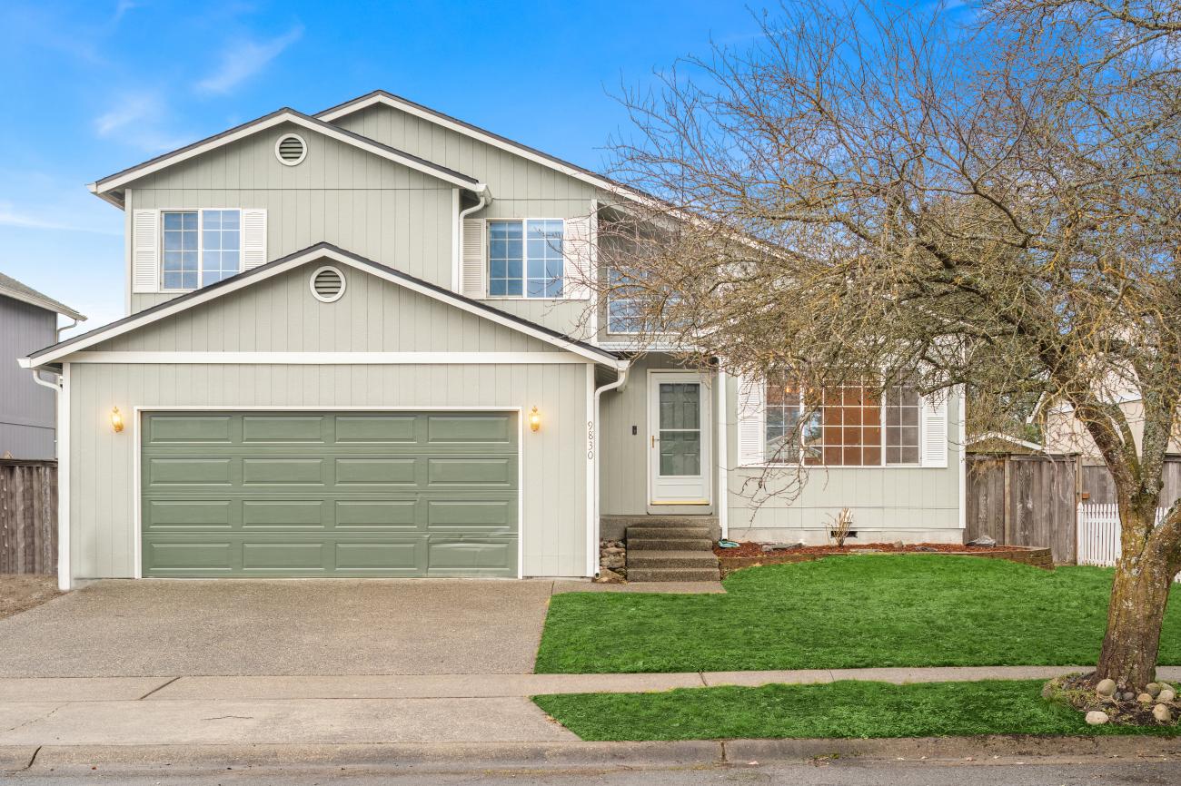 Discover your peaceful retreat in Yelm with breathtaking mountain views! This beautifully updated home offers a spacious, well-designed kitchen with eating space and a main living area featuring vaulted ceilings, skylights, and laminate flooring. The downstairs second living space is perfect for a playroom or additional living area. The garage is equipped with a workbench, den, heat, AC, and built-ins for a home office. Enjoy the outdoors with a securely fenced dog run or chicken area. This move-in ready home offers quality craftsmanship inside and out—don't miss out on this opportunity!