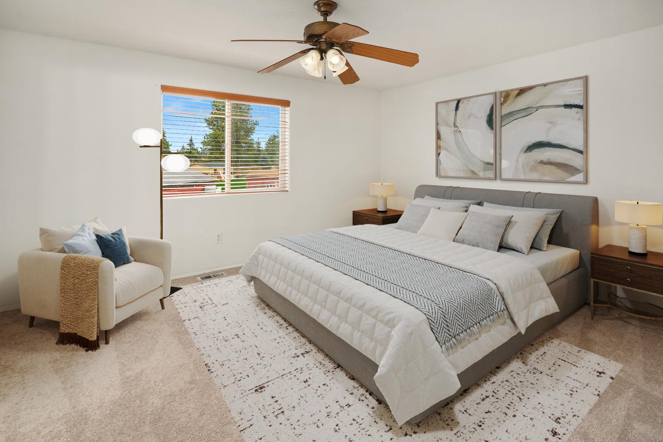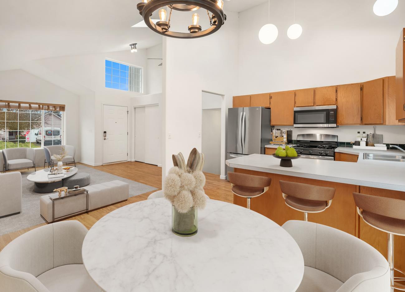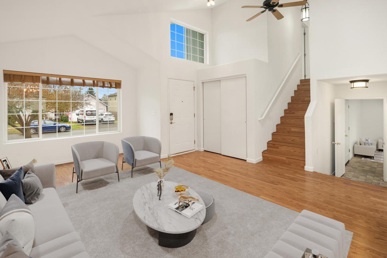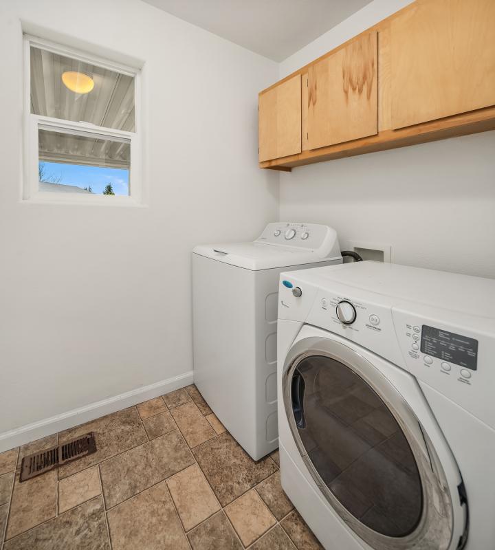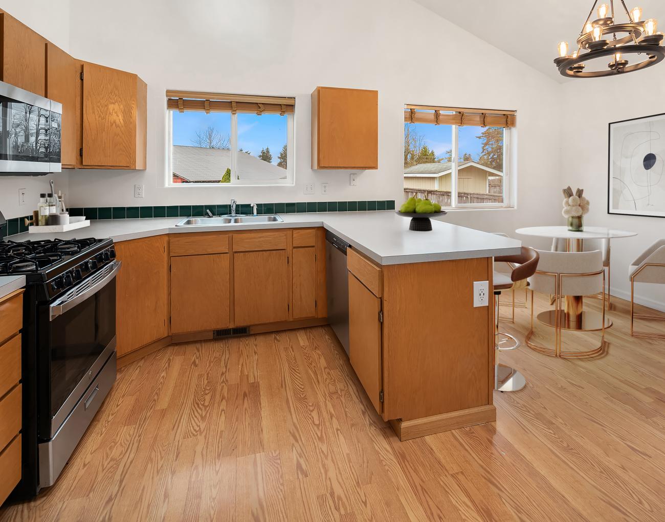 Discover your peaceful retreat in Yelm with breathtaking mountain views! This beautifully updated home offers a spacious, well-designed kitchen with eating space and a main living area featuring vaulted ceilings, skylights, and laminate flooring. The downstairs second living space is perfect for a playroom or additional living area. The garage is equipped with a workbench, den, heat, AC, and built-ins for a home office. Enjoy the outdoors with a securely fenced dog run or chicken area. This move-in ready home offers quality craftsmanship inside and out—don't miss out on this opportunity!